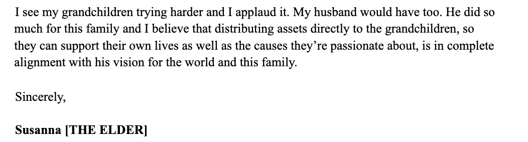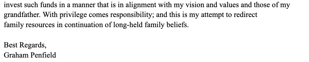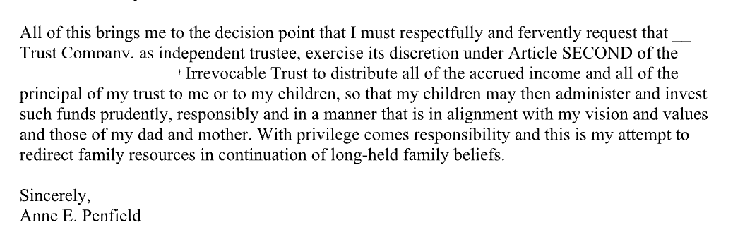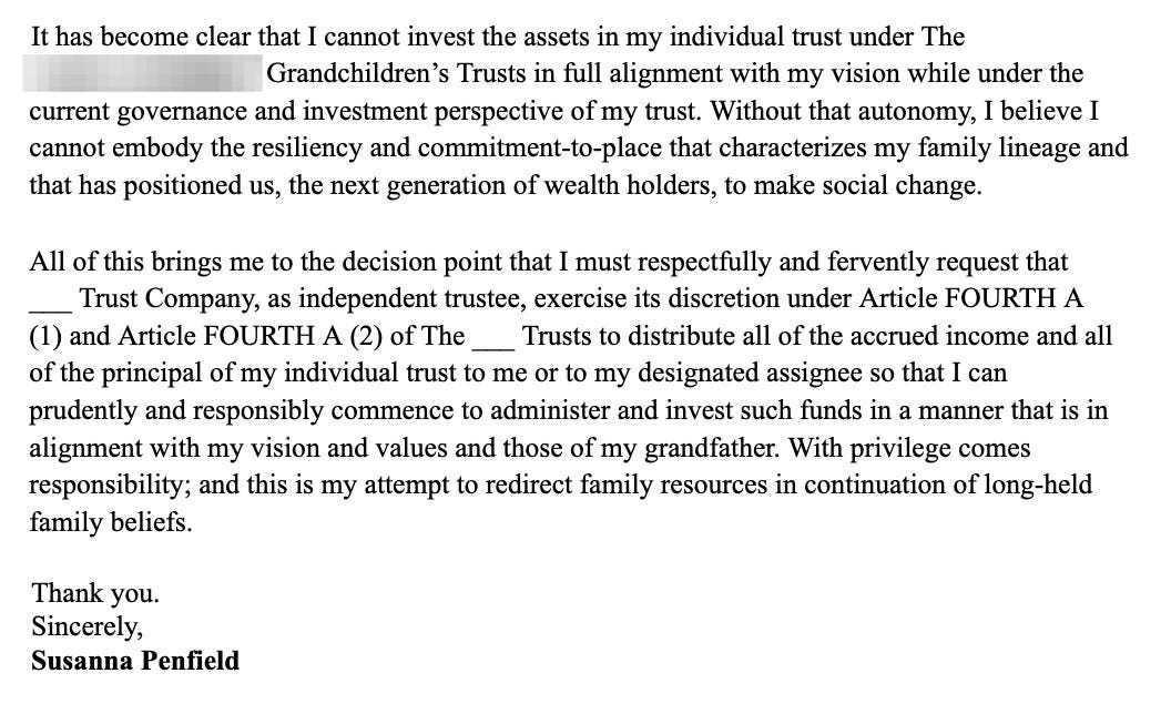 In October 2021, they said: We have been struggling with your requests because, while admirable, it is our responsibility (acting on behalf of a structure) to ensure that the trust be used over the course the rest of your life, as your grandfather intended (which, to be clear, was never cited). This means ultimately the level of giving and divestment you propose is not within your jurisdiction and therefore we will be divesting no more than $100k and limit your giving no more than 3-4% annually.